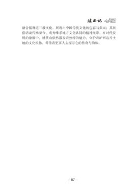 融合儒释道三教文化,展现出中国传统文化的包容与多元;其民 俗活动传承至今,成为维系地方文化认同的精神纽带。在时代发 展的浪潮中,桃笑山依然散发着独特的魅力,守护着泸西这片土 地的文化根脉,等待着更多人去探寻它的传奇与韵味。 - 87 -