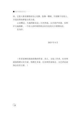 ■ 阿庐漫歌系列之 —— 的,它使人褒有激情而安心安静,仿佛一棵树,只要脚下有泥土, 开花结果的梦想自然天成。 云朵飘过,大地阴睛无定;江河奔流,山川涛声回荡。在阿 庐大地漫歌,一个诗人的吟唱终将会在历史的天空熠熠闪亮。 是为序。 2025 年 8 月 (作者系栖居滇南弥勒的作家、诗人、文化工作者,红河州 政协特聘文史专家、特聘艺术家,红河州作家协会、文艺评论家 协会名誉主席。) 8