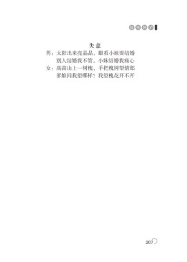情怀阿庐 失意 男:太阳出来亮晶晶,眼看小妹要结婚 别人结婚我不管,小妹结婚我痛心 女:高高山上一树槐,手把槐树望情郎 爹娘问我望哪样?我望槐花开不开 207