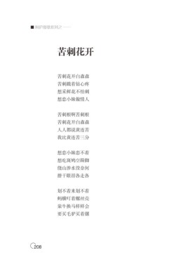 ■ 阿庐漫歌系列之 —— 苦刺花开 苦刺花开白森森 苦刺戳着钻心疼 想采鲜花不怕刺 想恋小妹做情人 苦刺根啊苦刺根 苦刺花开白森森 人人都说黄连苦 我比黄连苦三分 想恋小妹恋不着 想吃斑鸠空跺脚 绕山涉水没奈何 揩干眼泪各走各 划不着来划不着 蚂蟥叮着螺丝壳 粜牛换马样样会 要买毛驴买着骡 208