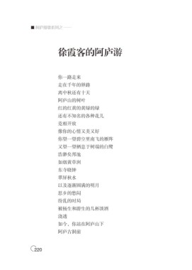 ■ 阿庐漫歌系列之 —— 徐霞客的阿庐游 你一路走来 走在千年的驿路 离中秋还有十天 阿庐山的树叶 红的红黄的黄绿的绿 还有不知名的各种花儿 竞相开放 像你的心情又美又好 你望一望碧空里南飞的雁阵 又望一望栖息于树端的白鹭 浩渺矣邦池 如烟黄草洲 东寺晓钟 翠屏秋水 以及逐渐圆满的明月 思乡的愁闷 纷乱的时局 被杨生和游生的几杯淡酒 浇透 如今,你站在阿庐山下 阿庐古洞前 220