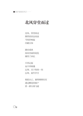 ■ 阿庐漫歌系列之 —— 北风穿堂而过 北风,穿堂而过 携带着世态炎凉 当风铃响起 冷暖自知 滴水成冰 冻结美丽的花色 凋零了回忆 不再记起 也不再相遇 忘却,关于你的一切 忘却,流年岁月 我把自己,裹得圆圆实实 透过雕花的窗户 看一群白鸽飞逝 78