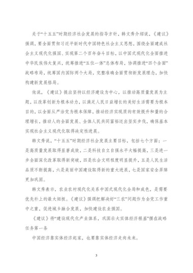 关于“十五五”时期经济社会发展的指导方针,韩文秀介绍说,《建议》