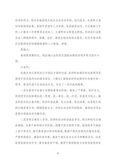 谢谢雷海潮同志。现在请江金权同志围绕加强党的领导等内容作介